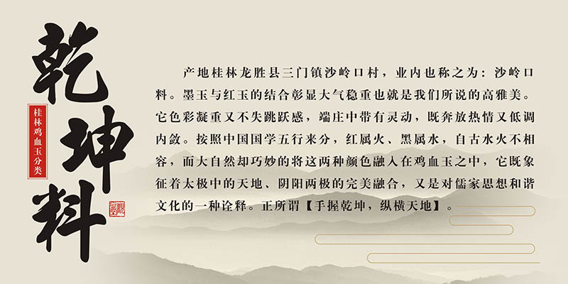 红与黑或白与黑,在中国传统文化的阴阳学说中都属于阴阳的两面。古代哲人认为,宇宙间一切事物都是由互相对立又互相依存的两个方面构成的,这两个方面就称为阴阳。阴阳交感而生宇宙万物,宇宙万物是阴阳的对立统一。风水古籍《雪心赋》中云:“孤阳不生,独阴不长。”《周易 系辞》 “一阴一阳之谓道。”都是指阴阳两个方面、两种力量构成事物的本性及其运动的法则,无论自然、人事,都表现此道。因此,桂林鸡血玉中的“黑地红”“黑白玉”成了中国传统文化阴阳学说的载体。由于红色是太阳的色彩,是热烈、冲动、强有力的色彩,在黑色的衬托下可以达到力量的无限扩大,所以备受赏石界青睐。