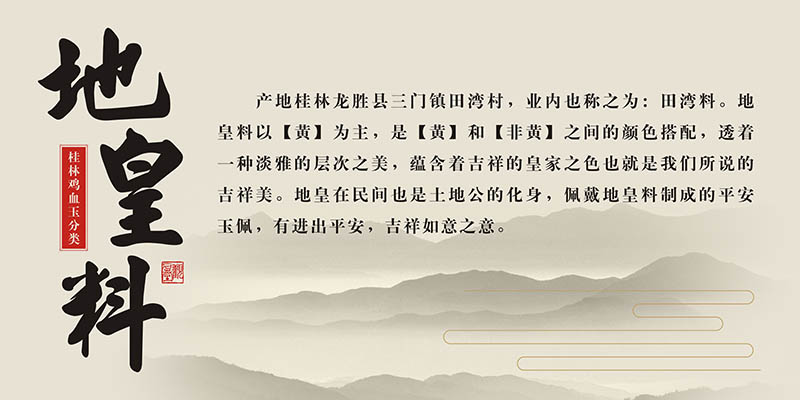 黄地鸡血玉又称“地皇料”,是桂林鸡血玉中另一高端玉种。黄色是三大基本色之一。在中国历史上,黄色是皇家独占的颜色,是王权的象征。从皇帝的龙袍到受宠的臣子被赏赐的黄马褂,皇帝出行时打的杏黄旗等,尽显黄色的尊贵。因中国古代历史上未发现黄玉,所以,田黄石一出世即被封为石帝,为皇家和显贵专宠。由于宗教和皇室的关系,某些宗教用品也用黄色,黄色因此又具有了神秘的色彩。